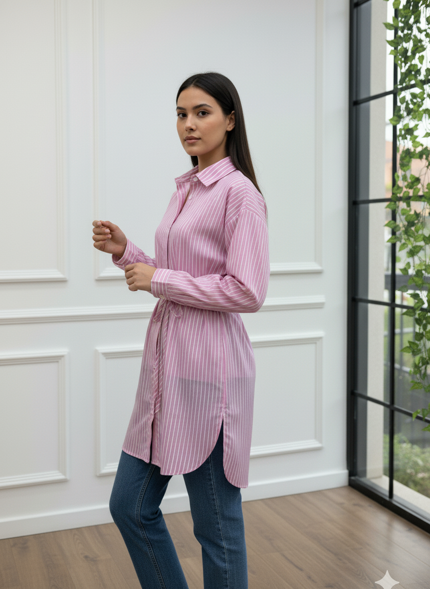 Canlı rengi ve ince dikey çizgileriyle enerjik bir görünüm sunan bu kuşaklı gömlek tunik ile stilinizi yenileyin. Beli vurgulayan kendi kumaşından kuşağı sayesinde zarif bir silüet oluşturan bu parça, modern kesimiyle öne çıkar. Hem ofis şıklığı hem de günlük kombinler için mükemmel bir seçim olan bu tuniği, pantolon veya taytlarla kolayca tamamlayarak çabasız bir şıklık yakalayabilirsiniz.