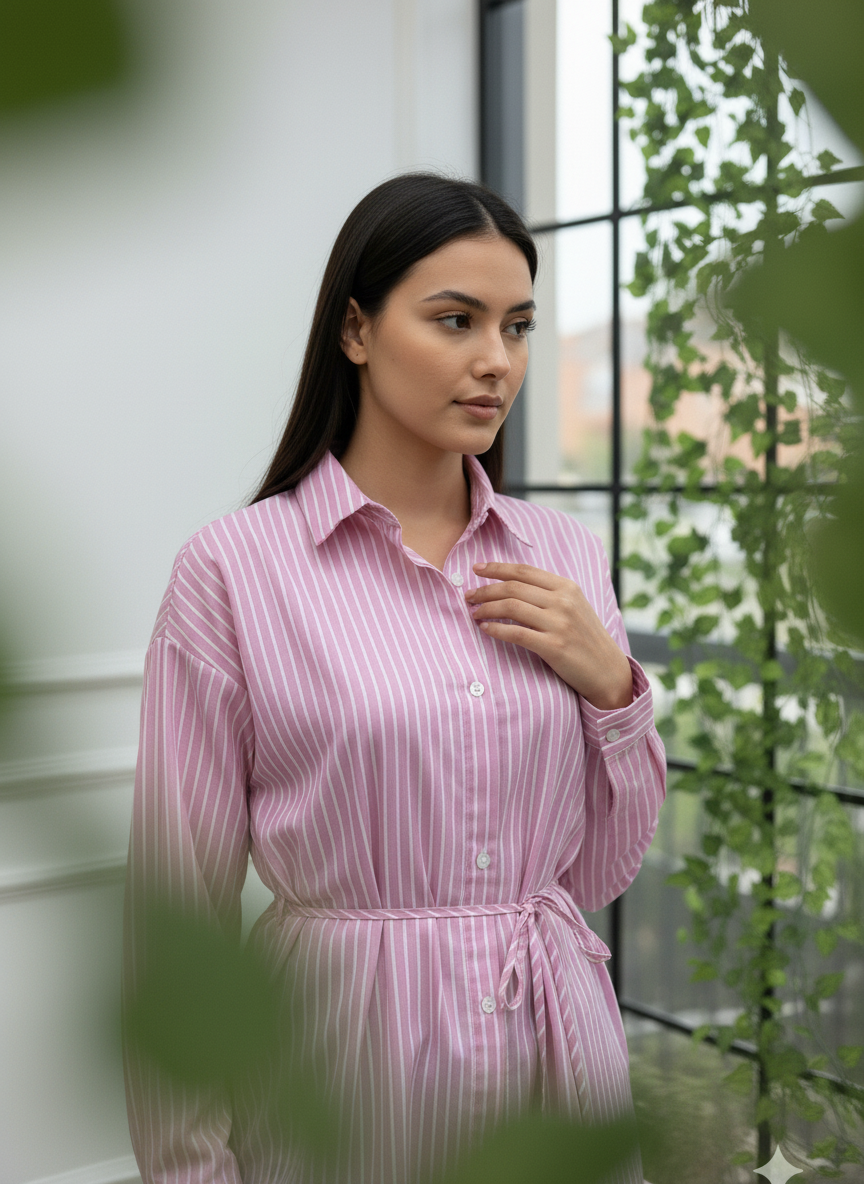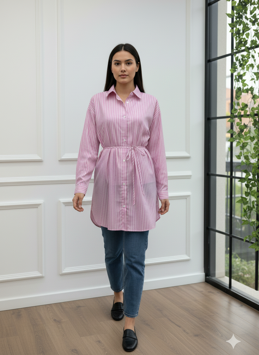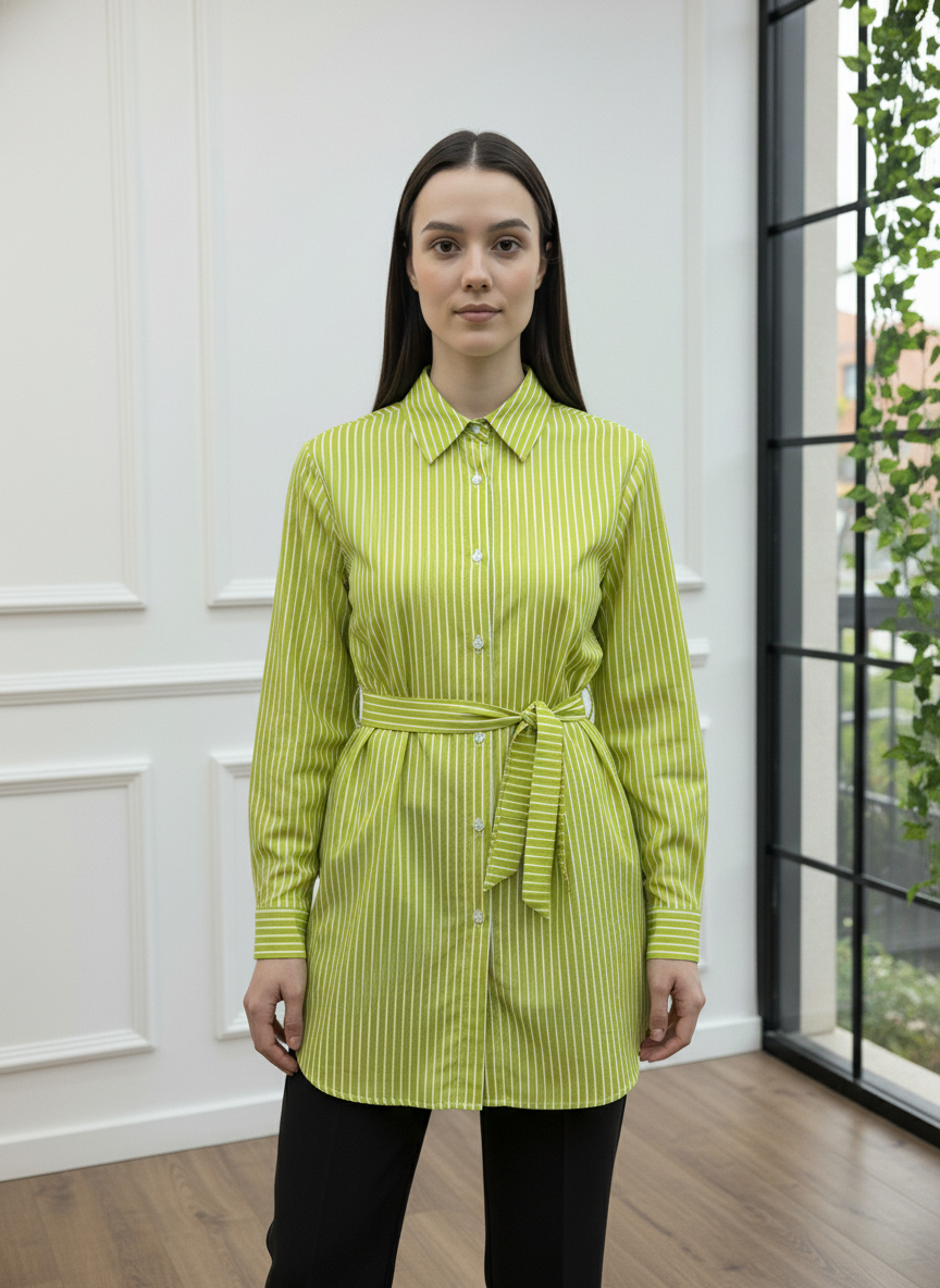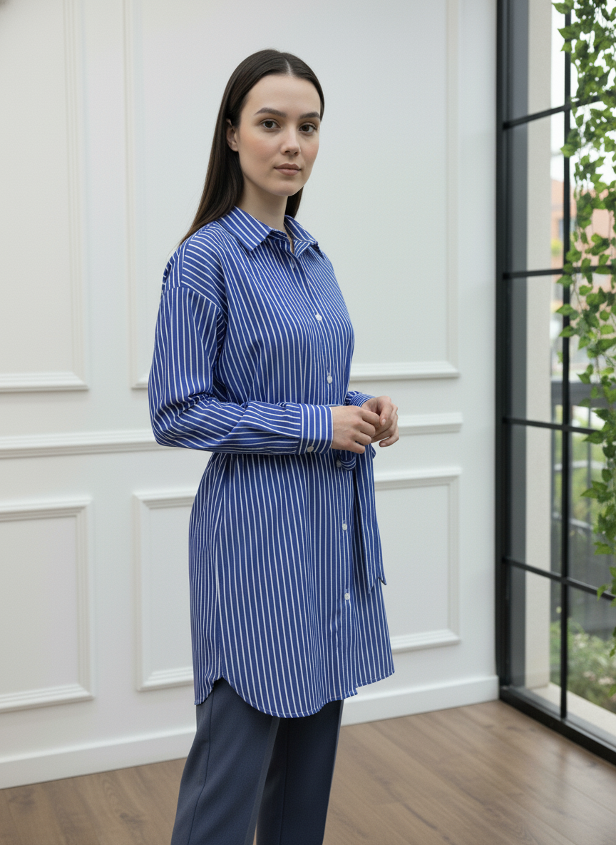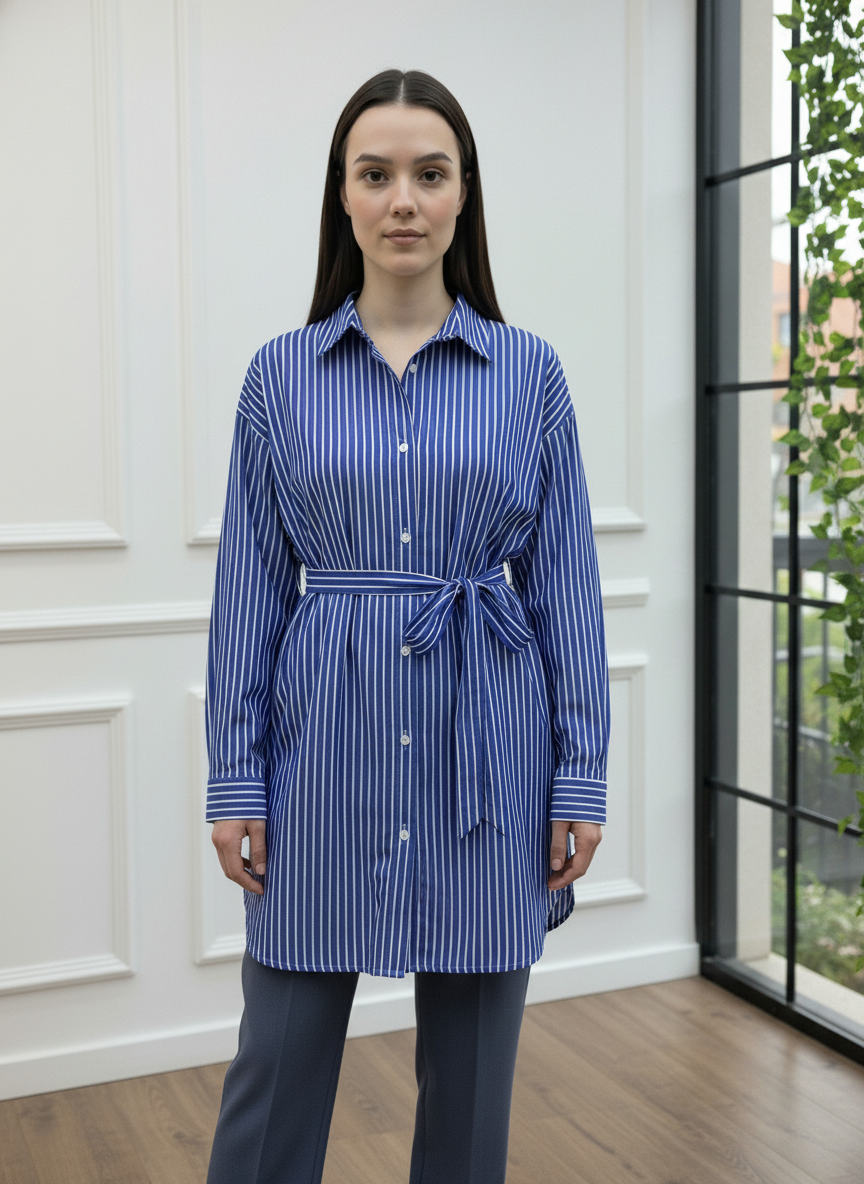 Beli Kuşaklı Çizgili Gömlek Tunik