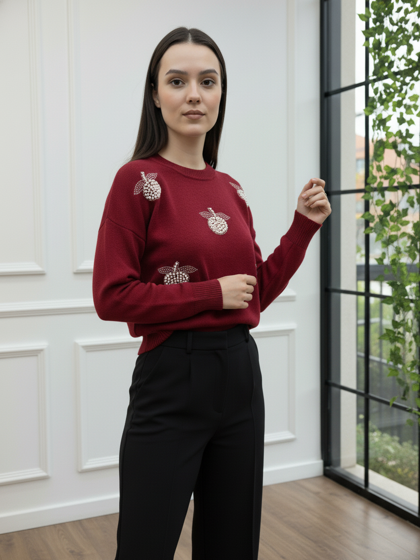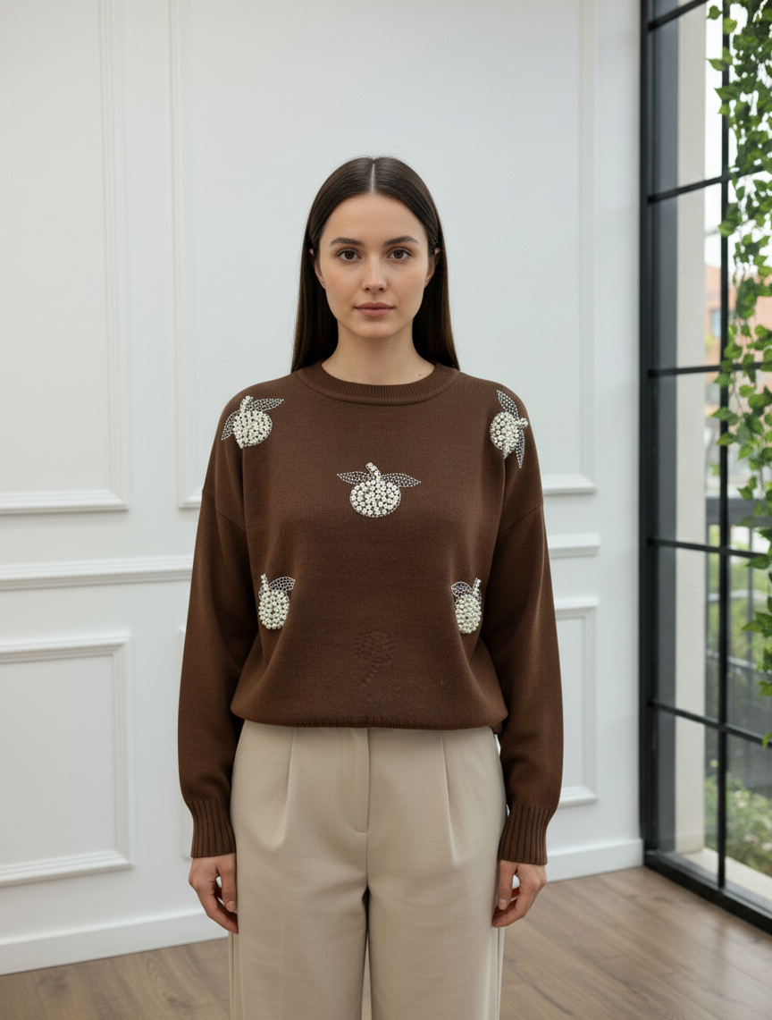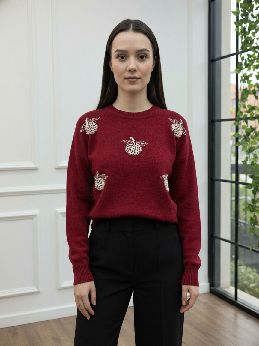Gardırobunuza neşeli ve şık bir dokunuş katmak için tasarlanan bu triko kazak, üzerindeki inci işlemeli elma figürleriyle göz alıcı bir stil sunuyor. Yumuşak ve kaliteli triko dokusu gün boyu konfor sağlarken, bisiklet yakası ve rahat kesimi modern bir görünüm yaratır. Hem günlük hem de özel anlarınızda, pantolon veya eteklerle kolayca kombinleyebileceğiniz bu eşsiz parça ile stilinizi bir adım öne taşıyın.