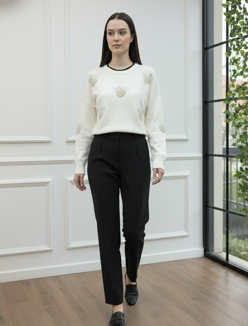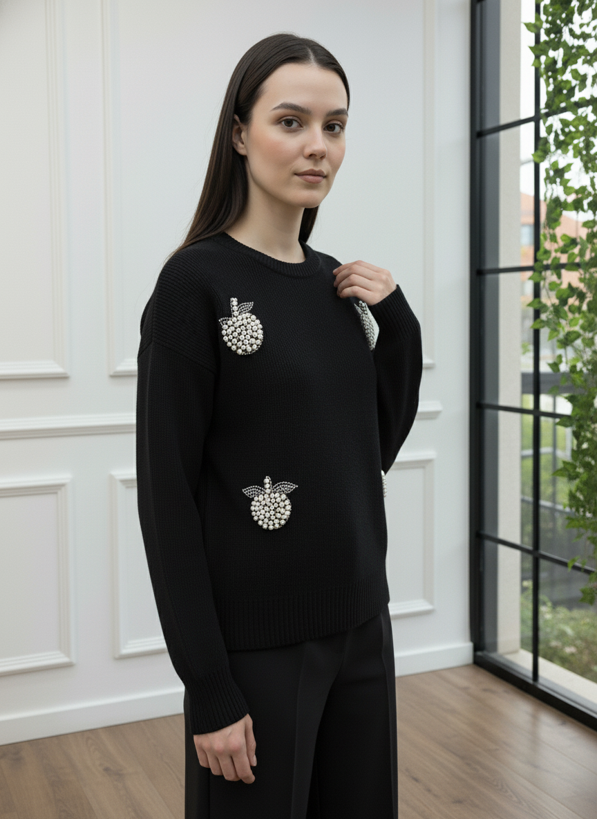 Omzu ve Kolu İnci İşlemeli Triko Kazak