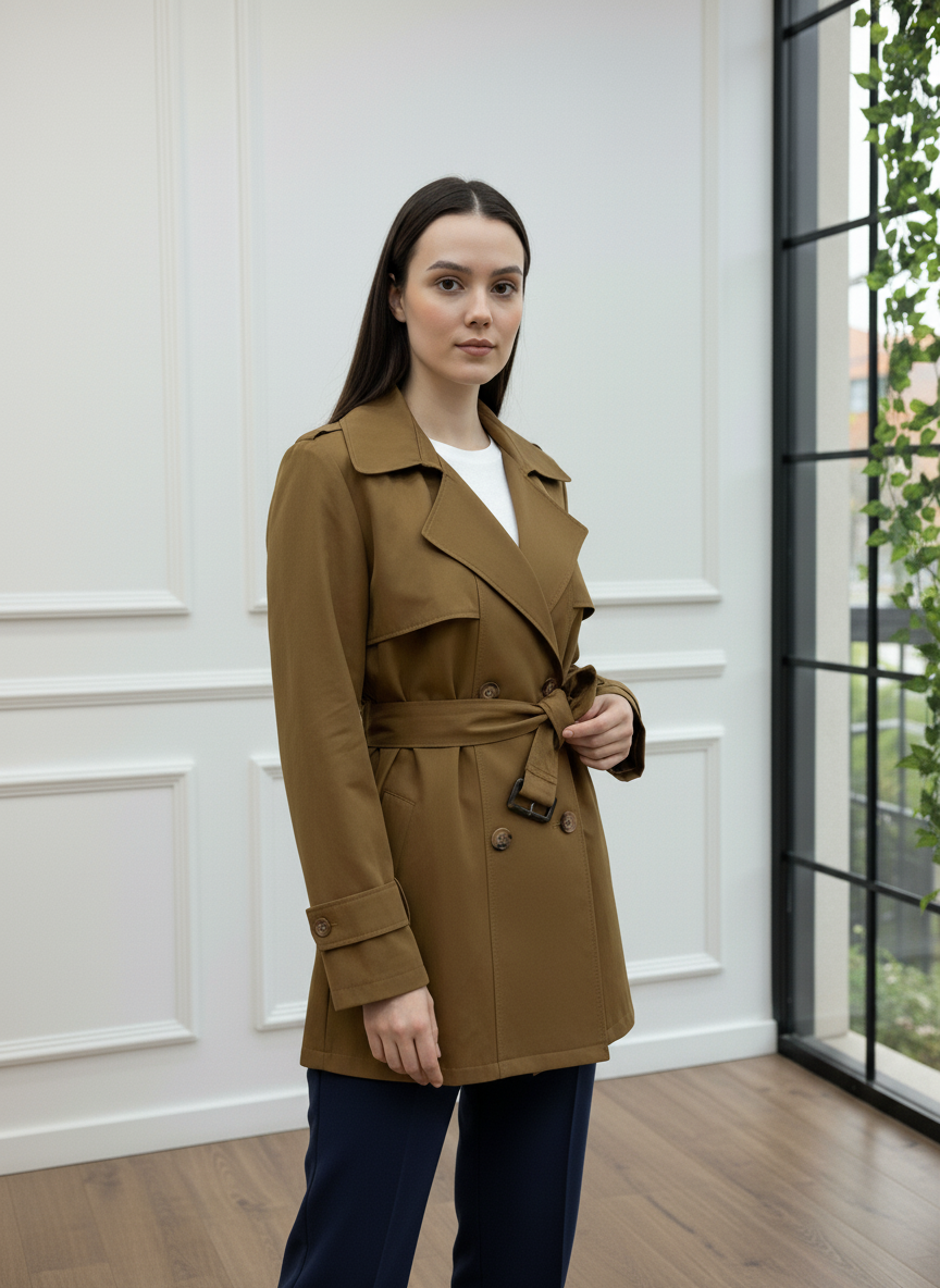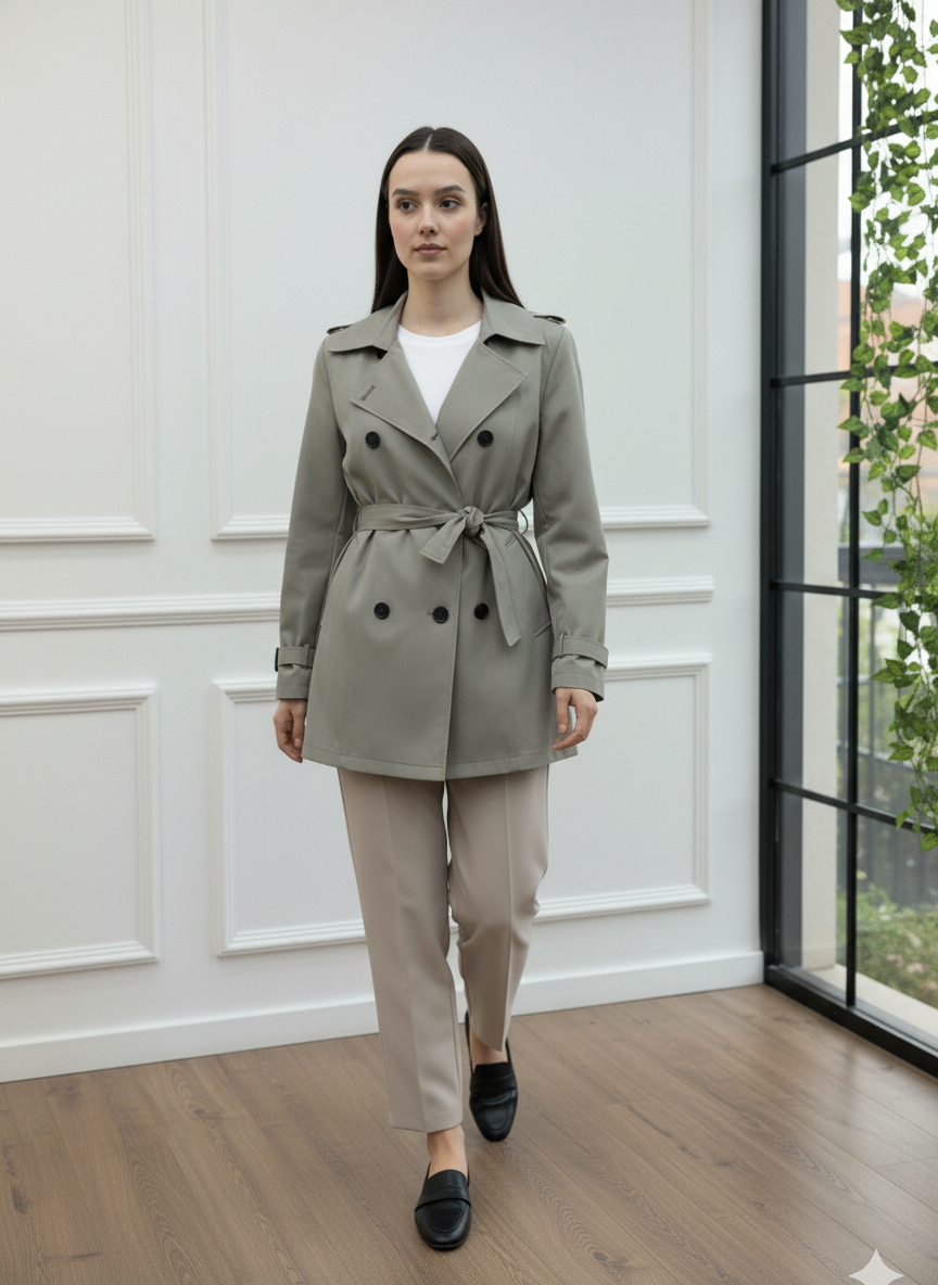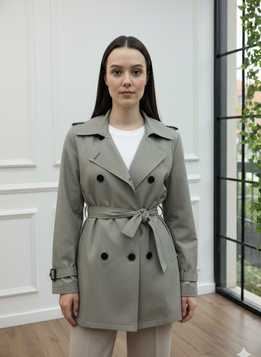 Zamansız şıklığın ve modern zarafetin mükemmel birleşimi olan bu klasik trençkot ile stilinizi tamamlayın. Kruvaze yaka tasarımı ve şık düğmeleriyle dikkat çeken bu parça, belinizi vurgulayan kuşağı sayesinde feminen bir silüet sunar. Kaliteli kumaşı, mevsim geçişlerinde sizi hem rüzgardan korur hem de konforlu bir kullanım sağlar. İster günlük kot pantolonlarınızla ister ofis şıklığınızı tamamlayan elbiselerinizle kombinleyin, bu trençkot her durumda zahmetsiz bir şıklık vaat ediyor. Gardırobunuzun vazgeçilmez bir yatırımı olacak bu parça ile her ana hazırlıklı olun.