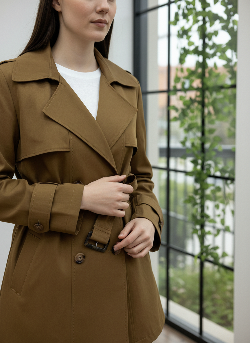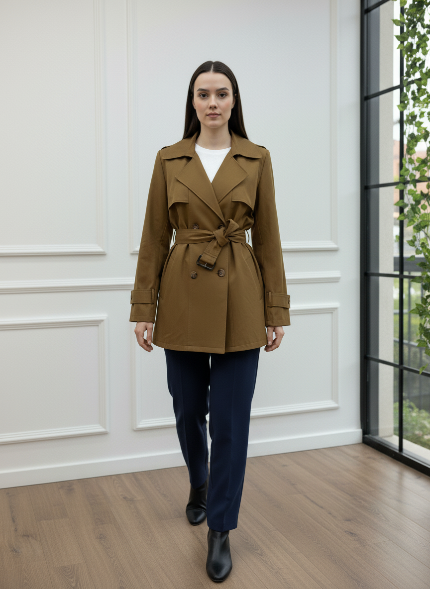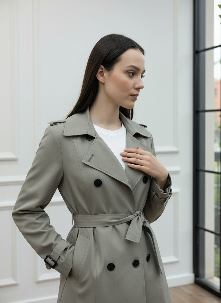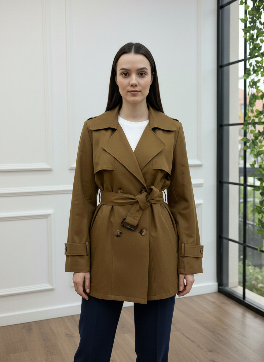 Zamansız şıklığın ve modern zarafetin mükemmel birleşimi olan bu klasik trençkot ile stilinizi tamamlayın. Kruvaze yaka tasarımı ve şık düğmeleriyle dikkat çeken bu parça, belinizi vurgulayan kuşağı sayesinde feminen bir silüet sunar. Kaliteli kumaşı, mevsim geçişlerinde sizi hem rüzgardan korur hem de konforlu bir kullanım sağlar. İster günlük kot pantolonlarınızla ister ofis şıklığınızı tamamlayan elbiselerinizle kombinleyin, bu trençkot her durumda zahmetsiz bir şıklık vaat ediyor. Gardırobunuzun vazgeçilmez bir yatırımı olacak bu parça ile her ana hazırlıklı olun.