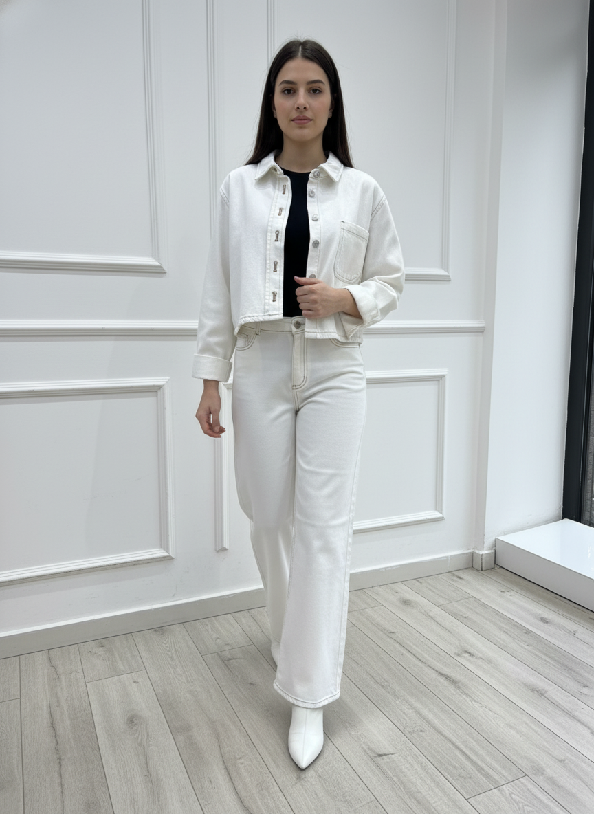 - Ürün İçeriği: Şık bir denim ceket ve uyumlu bol paça pantolondan oluşur.