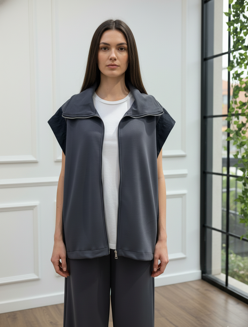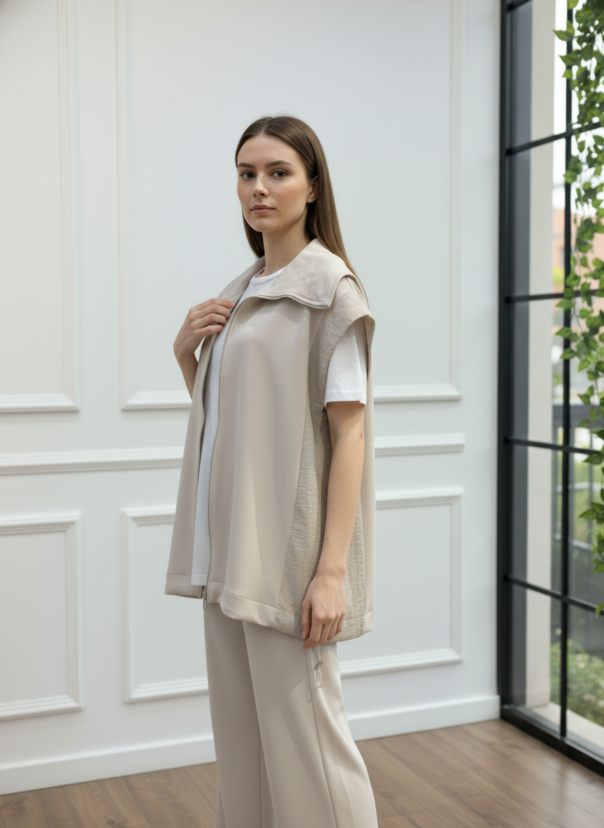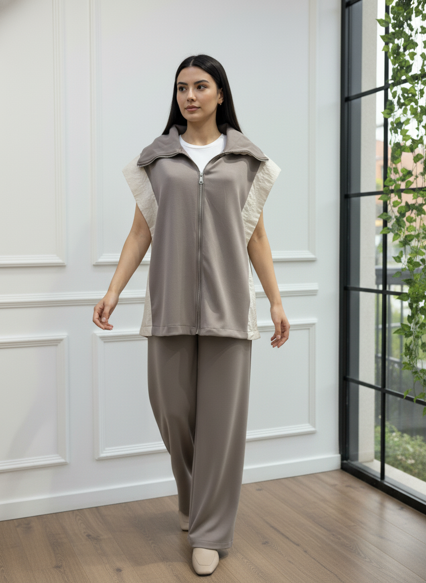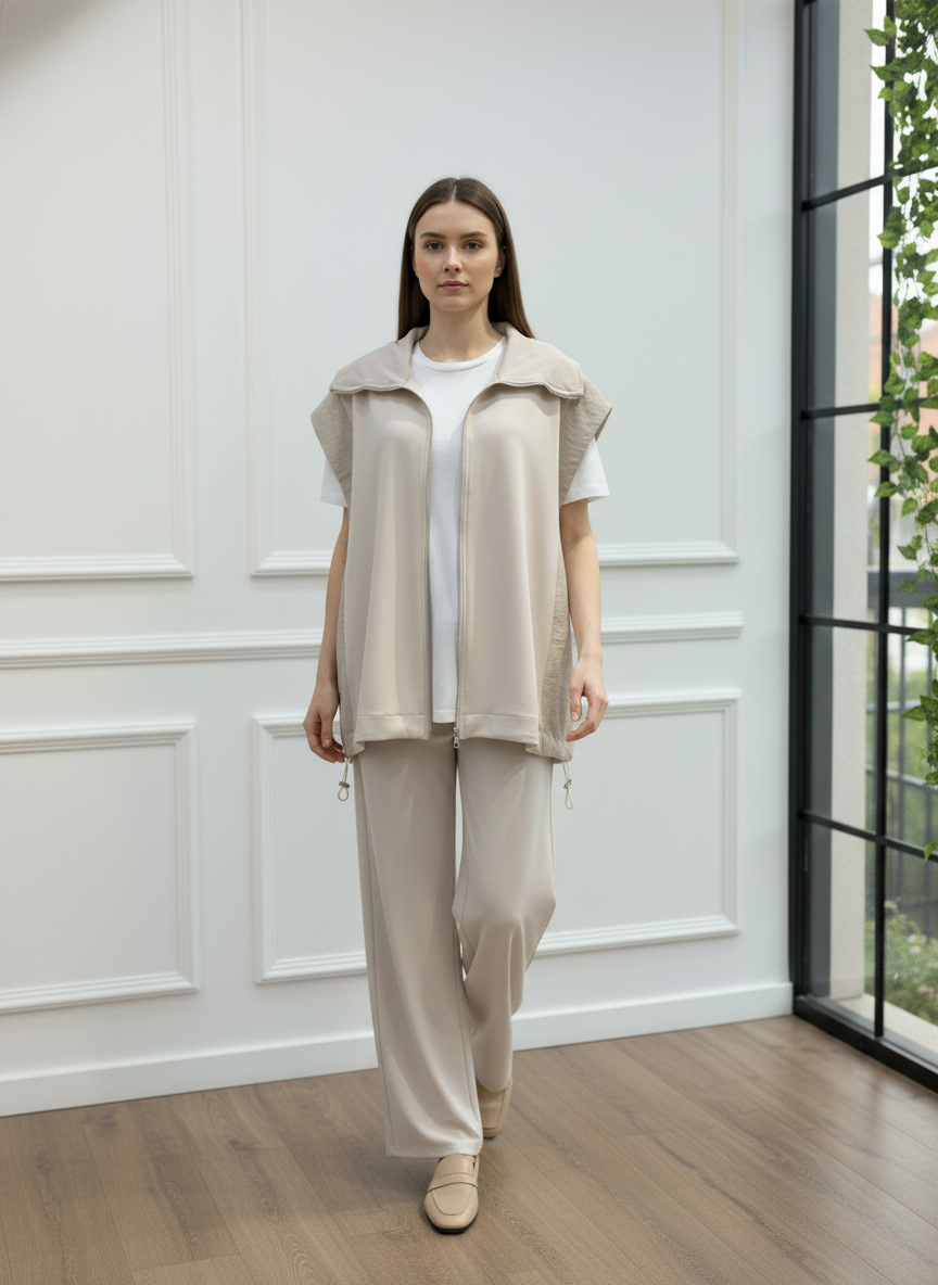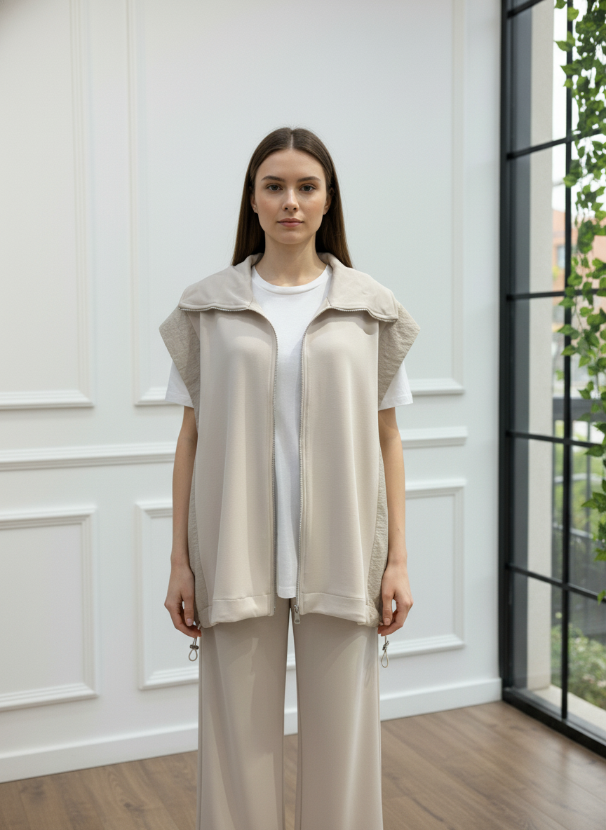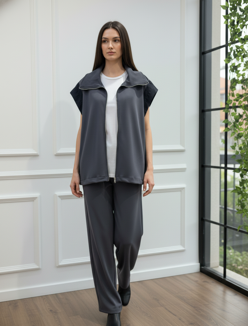 Modern ve konforlu stilin mükemmel birleşimi olan bu takım, gardırobunuzun yeni favorisi olacak. Fermuarlı ve şık dik yakalı yelek, yanlarındaki paraşüt kumaş garni detayı ile tasarıma özgün bir hava katıyor. Yüksek bel ve geniş paça kesimli pantolonu ise gün boyu maksimum konfor ve hareket özgürlüğü sunar. İster set olarak ister ayrı ayrı parçalarla kombinleyerek stilinize çok yönlülük katın. Bu takımla hem rahatlığı hem de şıklığı aynı anda yakalayın.
