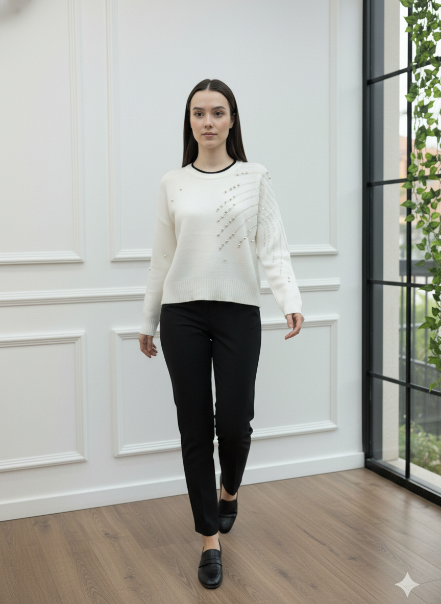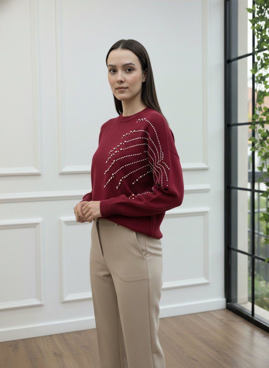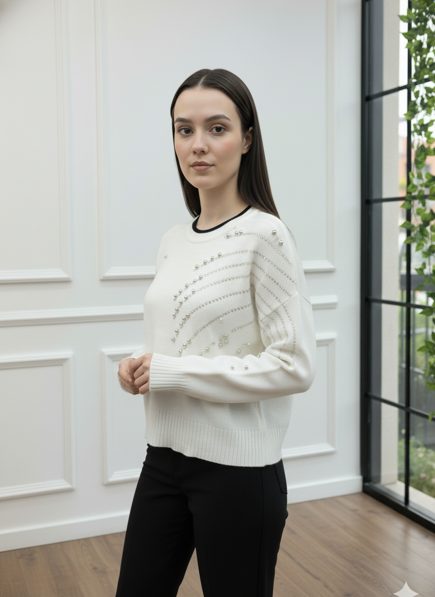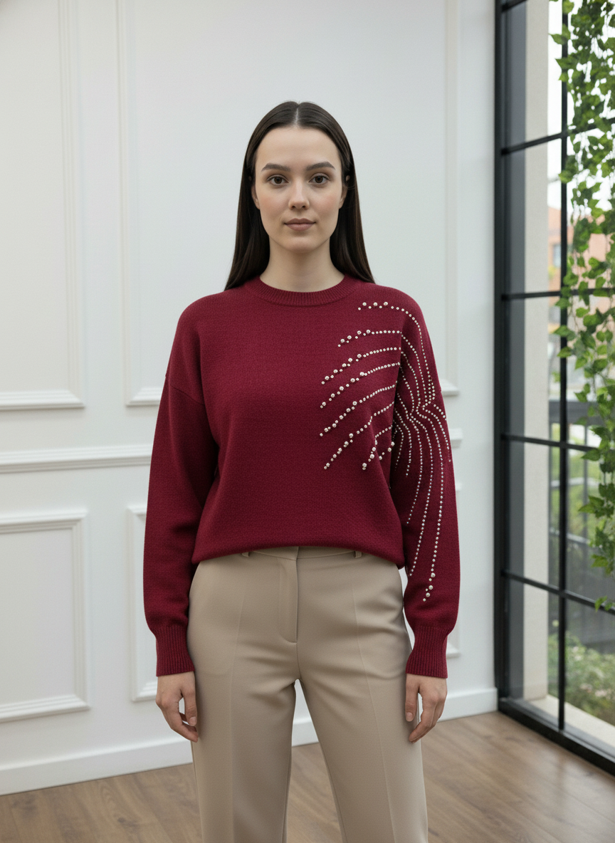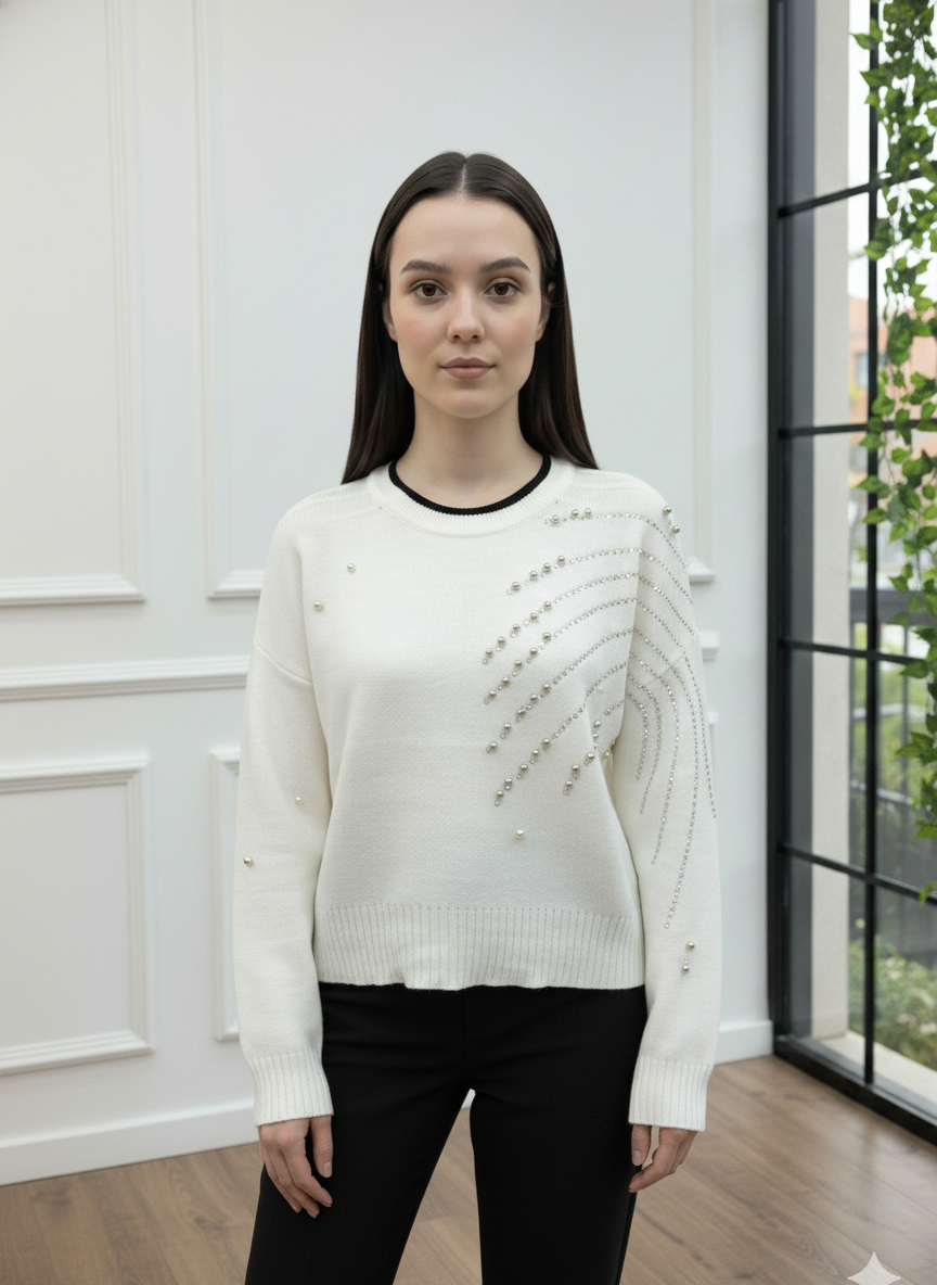 Omzu ve Kolu İnci İşlemeli Triko Kazak