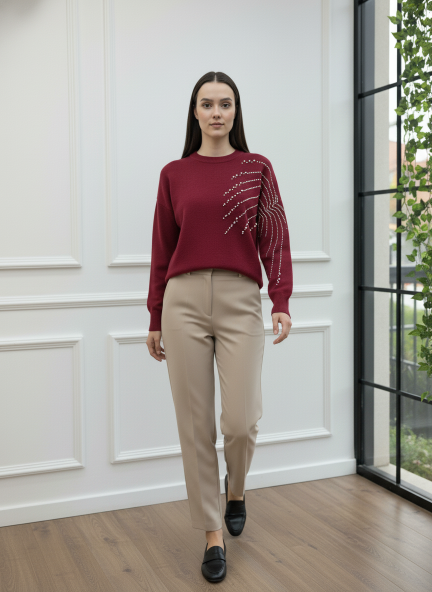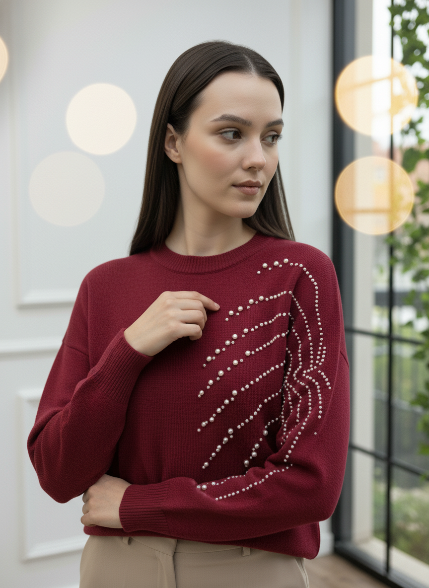 Şıklığı ve zarafeti bir araya getiren bu özel tasarım bordo triko kazak ile stilinize ışıltı katın. Yumuşacık dokusu ve rahat kalıbıyla gün boyu konfor sunarken, omzundan koluna doğru zarifçe süzülen inci ve taş işlemeleriyle tüm bakışları üzerinize çeker. Kusursuz bir işçilikle yerleştirilmiş bu detaylar, sade bir parçayı göz alıcı bir şıklığa kavuşturuyor. İster kumaş pantolonlarla ofis şıklığınızı tamamlayın, ister bir jean ile kombinleyerek günlük stilinize sofistike bir dokunuş katın. Bu zamansız parça, gardırobunuzun vazgeçilmezi olmaya aday.