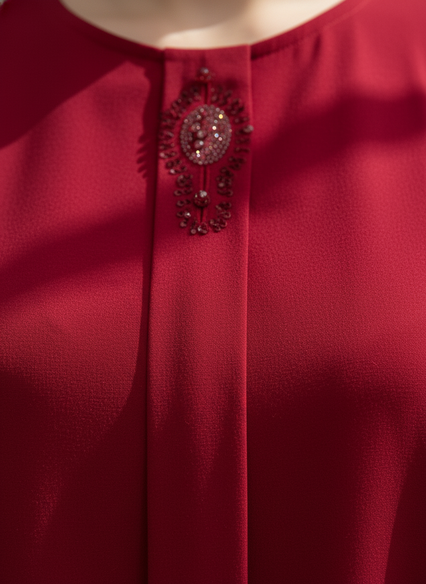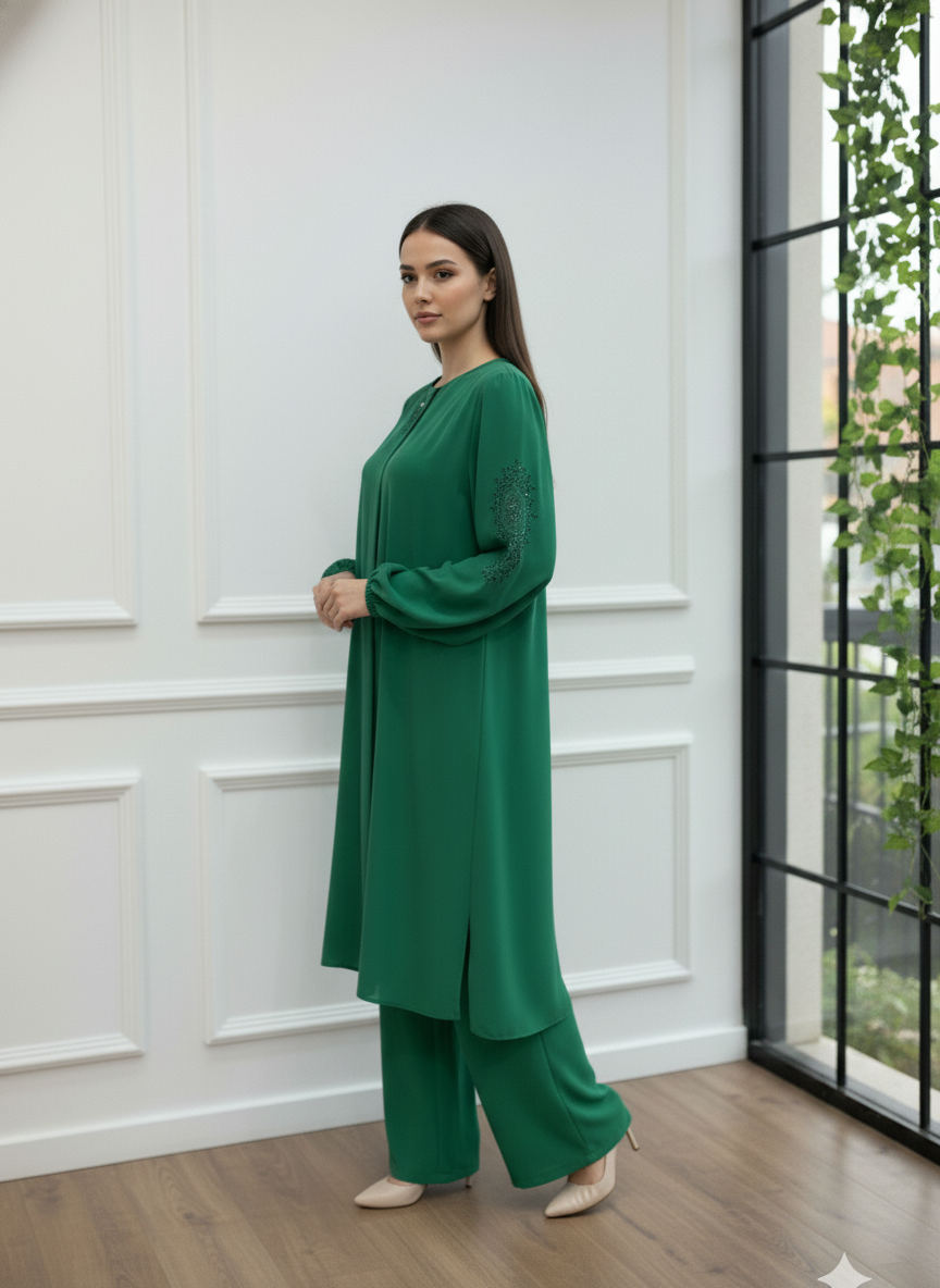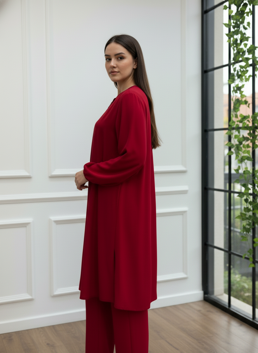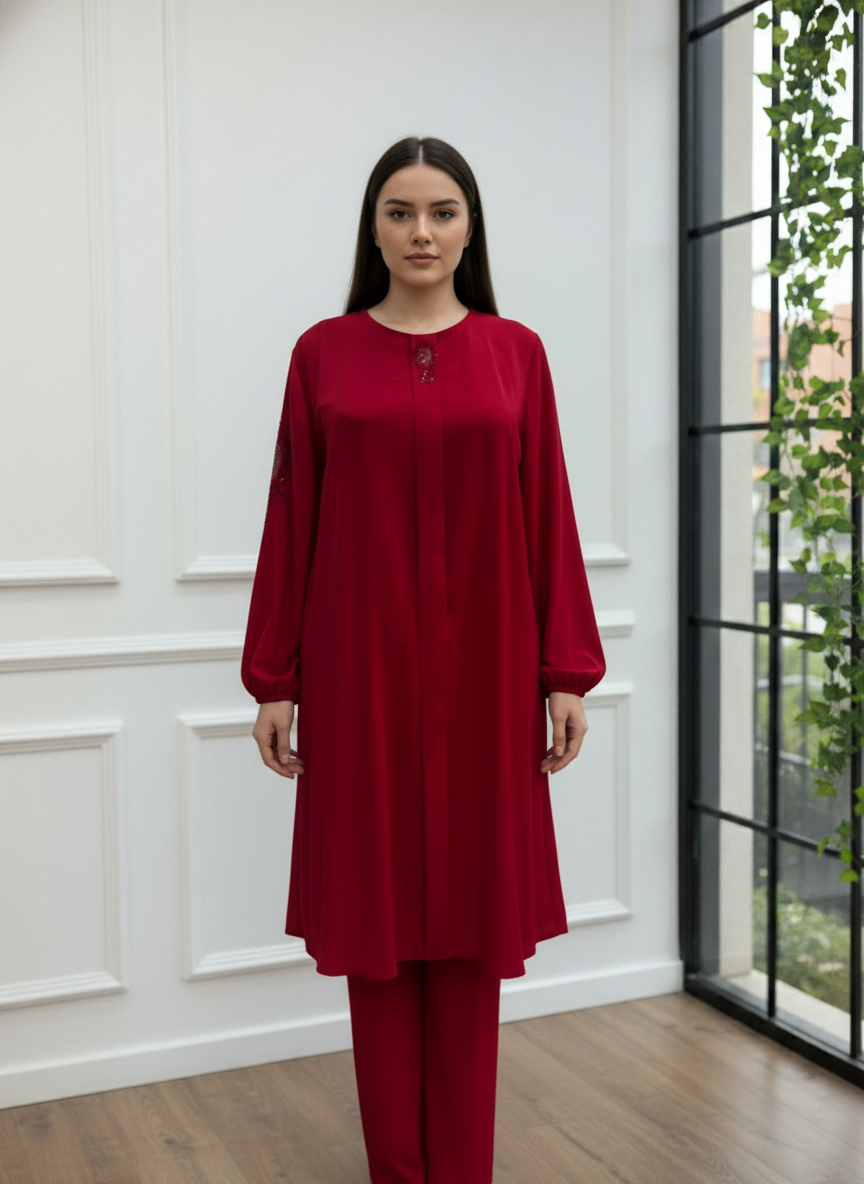 Gardırobunuzun en asil parçası olmaya aday, göz alıcı bordo rengiyle tasarlanan bu ikili takım, zarafeti ve konforu bir arada sunuyor. Yaka kısmında yer alan ince taş işlemeleri, sadeliğe ışıltılı bir dokunuş katarken, dökümlü krep kumaşı gün boyu hareket özgürlüğü sağlar.