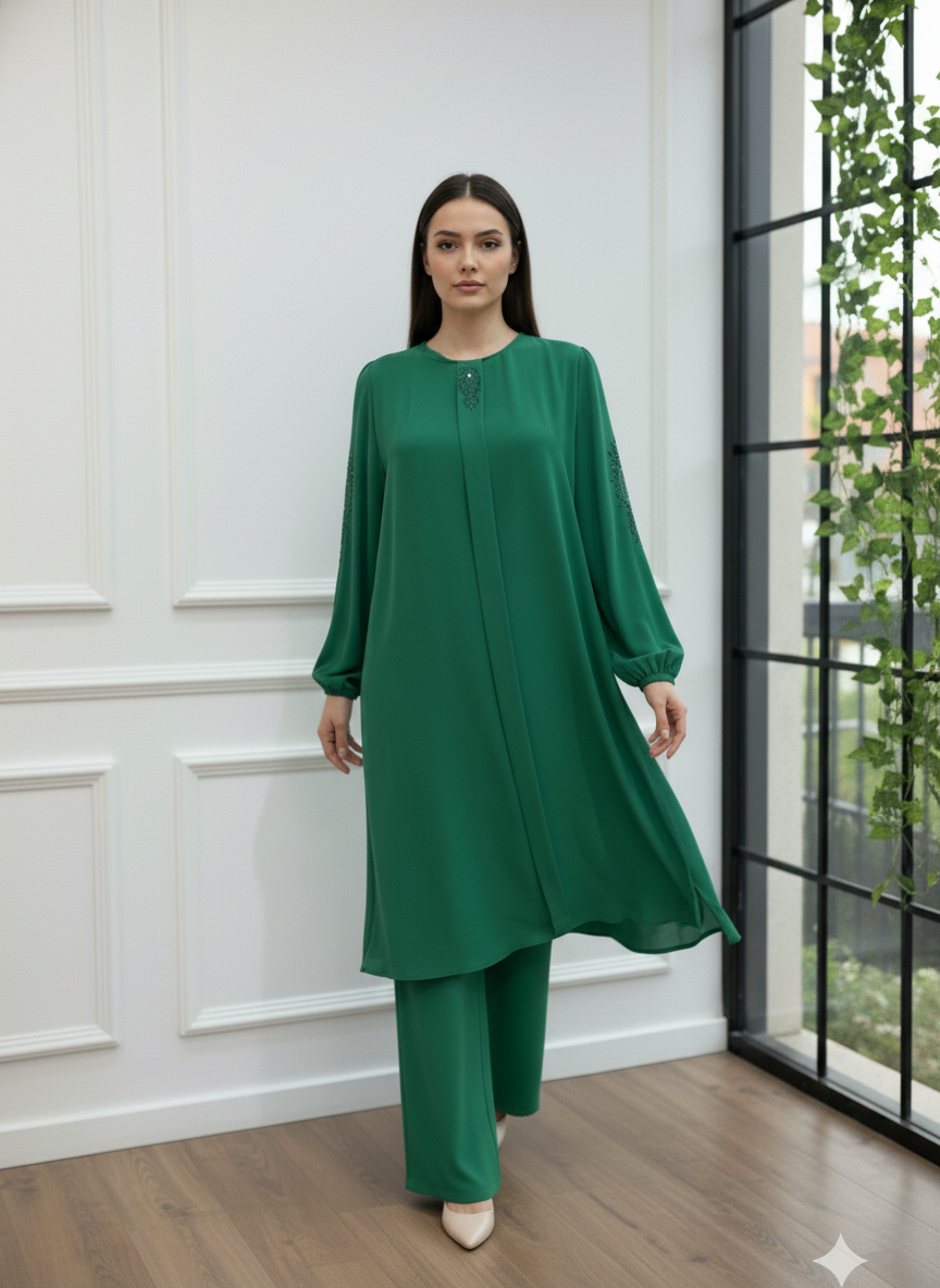Hem ofis şıklığında hem de özel davetlerde tercih edebileceğiniz bu takım, modern kesimiyle vücut hatlarını nazikçe sarar ancak sıkmaz. Tunik ve pantolon uyumu, kombin yapma derdini ortadan kaldırarak hazır bir şıklık sunar.