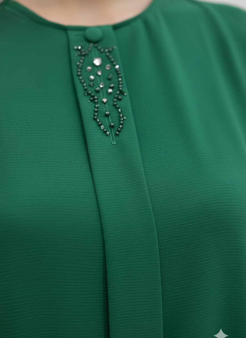 - Tunik Detayları: Bisiklet yaka, zarif taş işleme detaylı, büzgülü manşetli uzun kol.